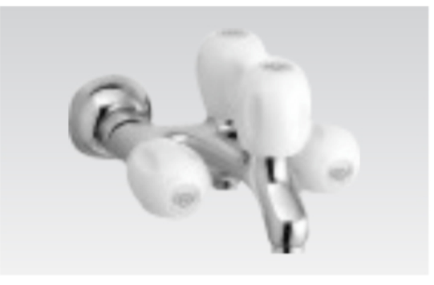 It is a type of bathroom fitting, specifically a mixer for a sink or shower.  The product range is manufactured by Faisal Sanitary Fitting Industries, a company established in 1974.  It is a Pakistani-made product and a leading brand in the country.  The image shows a wall-mounted design with four white handles and a chrome finish. Brass is an alloy of copper and zinc that is popularly used for manufacturing faucets because of its property to be resistant to corrosion and hard-water calcification. The components of a faucet can be made up of metals other than copper and zinc. These are received as finished components from other manufacturers. This stylish and functional sink and bath mixer is perfect for any modern bathroom. It has a smooth design, is easy to use, and offers precise pressure control
