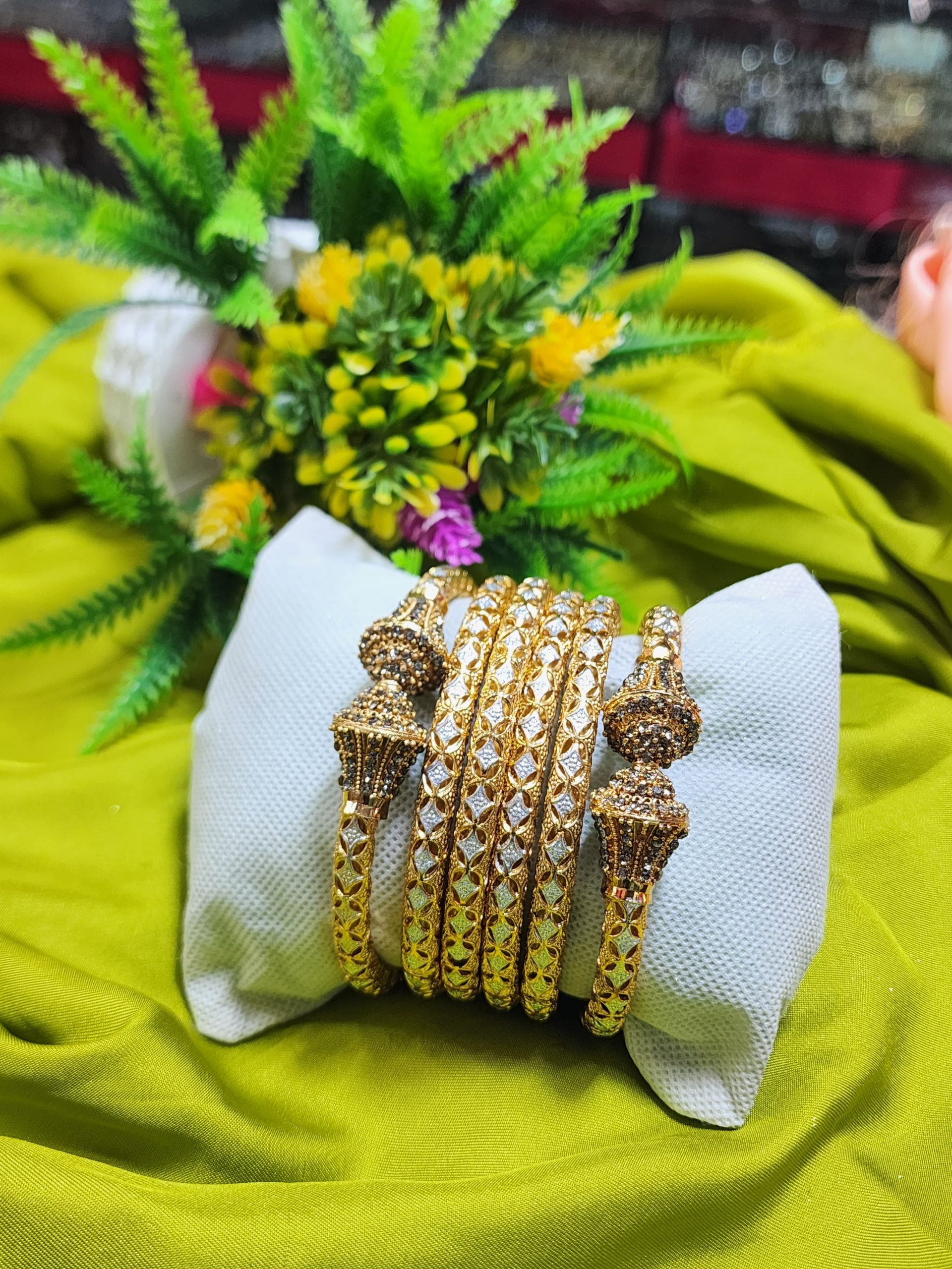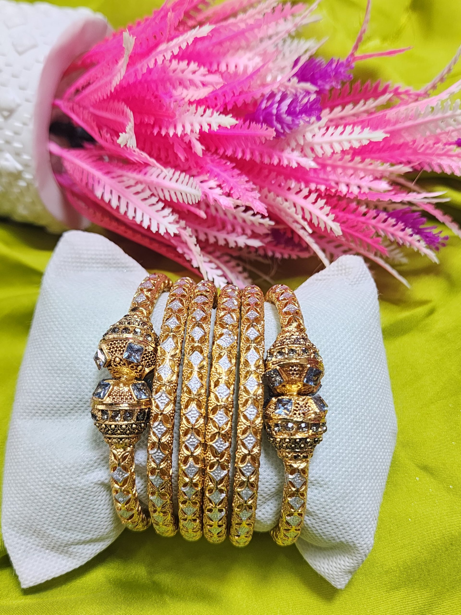 Add a touch of elegance to your collection with these exquisite casting made Gold plated Kara set adorned with shimmering small stones and intricate fine detailing. Each bangle is crafted with precision showcasing a blend of traditional charm and modern sophistication. Perfect for special occasions or for weddings celebrations or everyday looks. These bangles bring a bold yet graceful statement to any outfit. Embrace timeless beauty with jewelry that is designed to captivate. Made from Premium Quality Material. Its High Quality material is Suitable for Daily Wear or as a Present to You and Your Lover. Classic antique style bangles Design. These are Stylish and Delicate for Everyday Wear. Available in different colors. Perfect For any occasion.