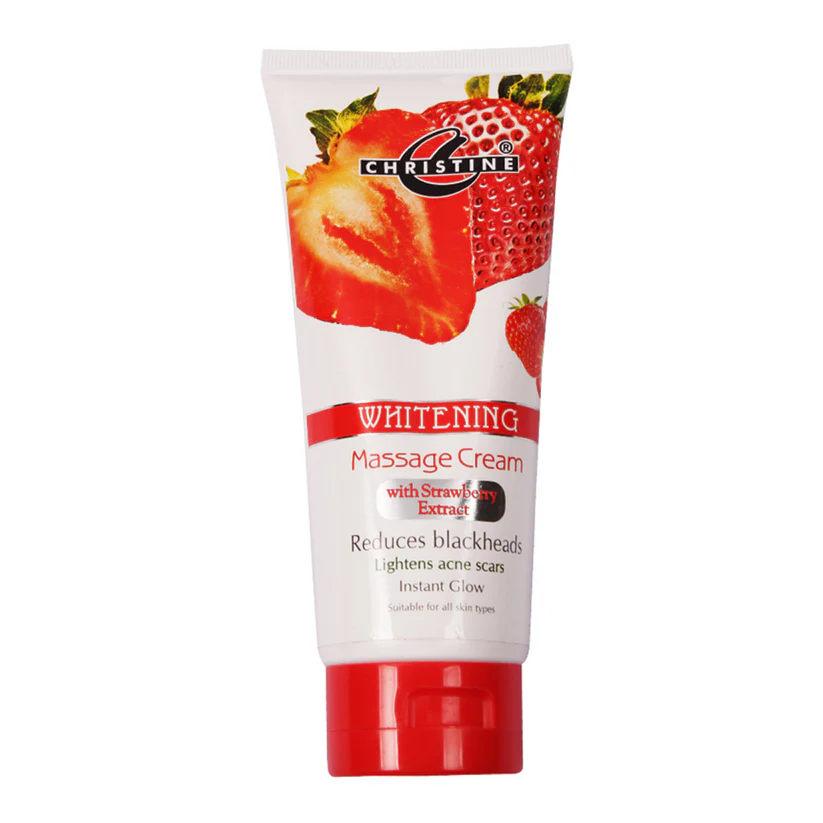 Christine Whitening Massage Cream is a specially formulated cream designed to deliver intensive hydration and nourishment while promoting skin brightness. The rich texture of this cream makes it perfect for facial and body massages, helping to relax the skin while enhancing its overall appearance. The inclusion of strawberry extract provides a delightful aroma and additional skincare benefits, making this cream a luxurious addition to your routine.