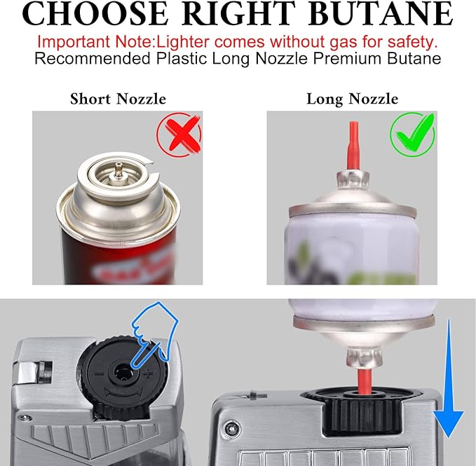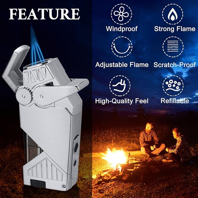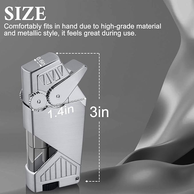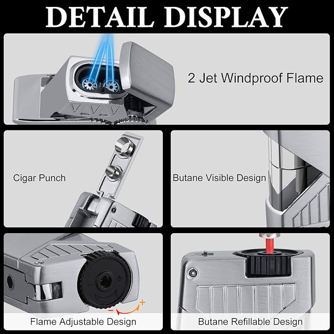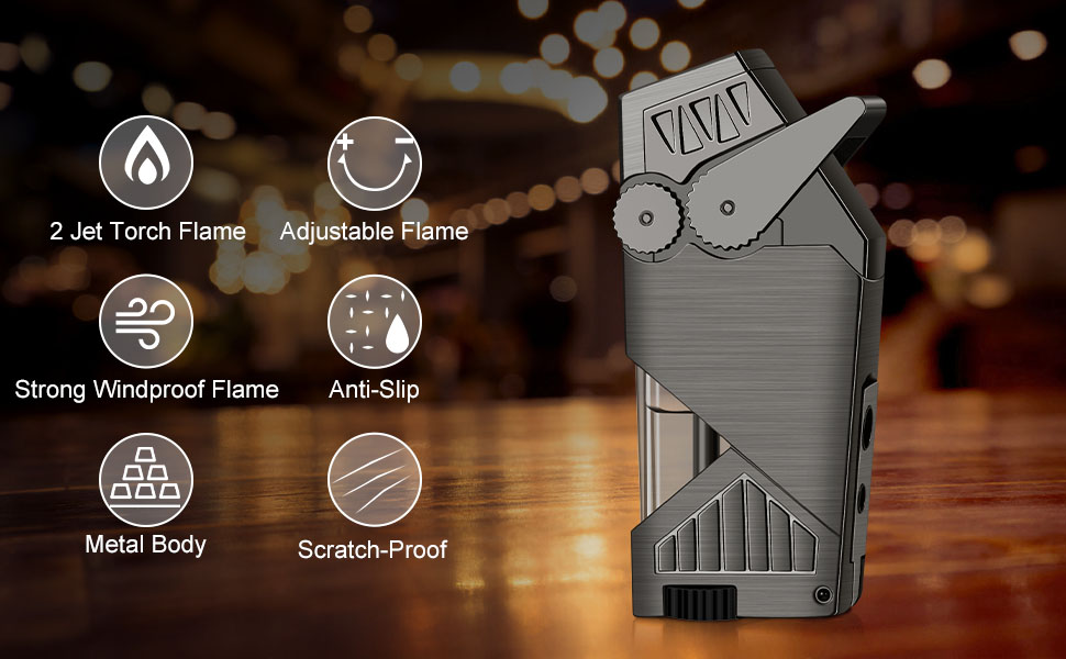 This torch lighter consist of 2 burners, which produce strong and powerful turbo jet torch flame, it can light your target quickly and evenly. Meet your needs in different scenarios. The refillable butane cigar lighter is made of premium alloy material, drawing craft plus electroplating polishing, all these procedure make this torch lighter sturdy, wear-resistant and high-temperature resistant. This windproof torch cigar lighter with universal refill valve and a visible fuel window which makes it easy to observe the butane level when filling and using, it is convenient to remind and replenish butane in time. The direct 2 jet torch flame is windproof and powerful, even in a windy environment, it can be easily and quickly ignited. This refillable butane torch lighter has an adjustment wheel at the bottom, you can rotate the adjustment wheel to adjust the flame height. If the valve is too large or too small, it is not conducive to igniting the flame. If you fill the lighter with butane and the ignition fails, you can try to adjust the valve to find a suitable ignition point, and then the lighter will work normally.