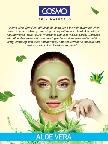 Cosmo Aloe Vera Peel-off Mask helps to keep the skin hydrated while cleans up your skin by removing oil, impurities and dead skin cells, a natural way to leave your skin cleaner with less visible pores. Enriched with Aloe Vera extract & other key ingredients. It soothes while moisturizing, ensuring skin feels soft and silky-smooth, refreshes the skin and makes it vibrant and look more youthful.