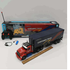 - This is a heavy truck set designed for kids, featuring a red cab and a dark blue container trailer.