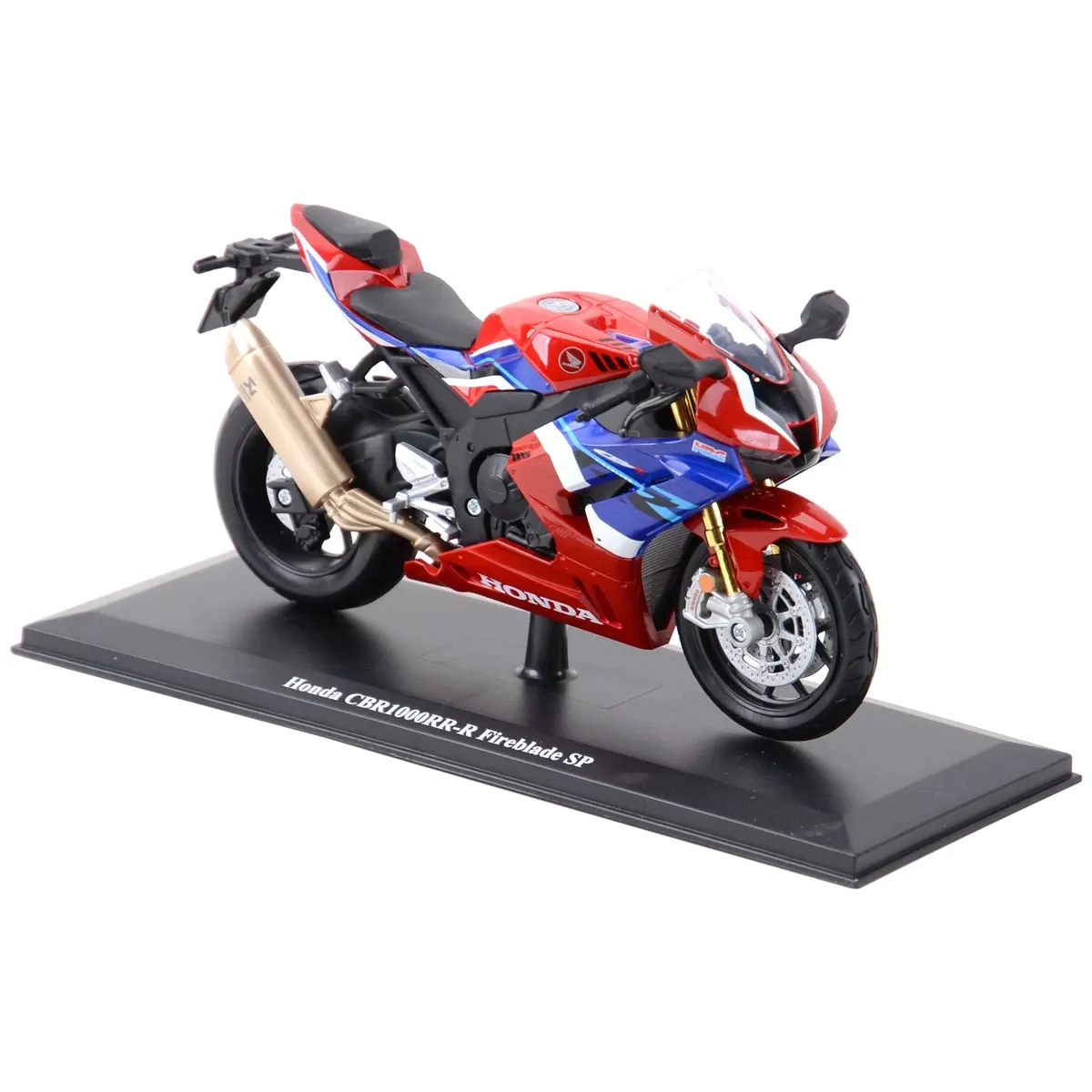 Brand new 1/12 scale diecast motorcycle model of Honda CBR 1000RR-R Fireblade SP Red and Blue die cast motorcycle model by Maisto. Brand new box. Detailed exterior. Real rubber tires. Wheels roll and steer. Officially licensed product. Made of die cast metal with some plastic parts. Approximate dimensions: L-6.75, W-2.5, H-3.75 inches. Please note that manufacturer may change packing box at any time. Product will stay exactly the same.