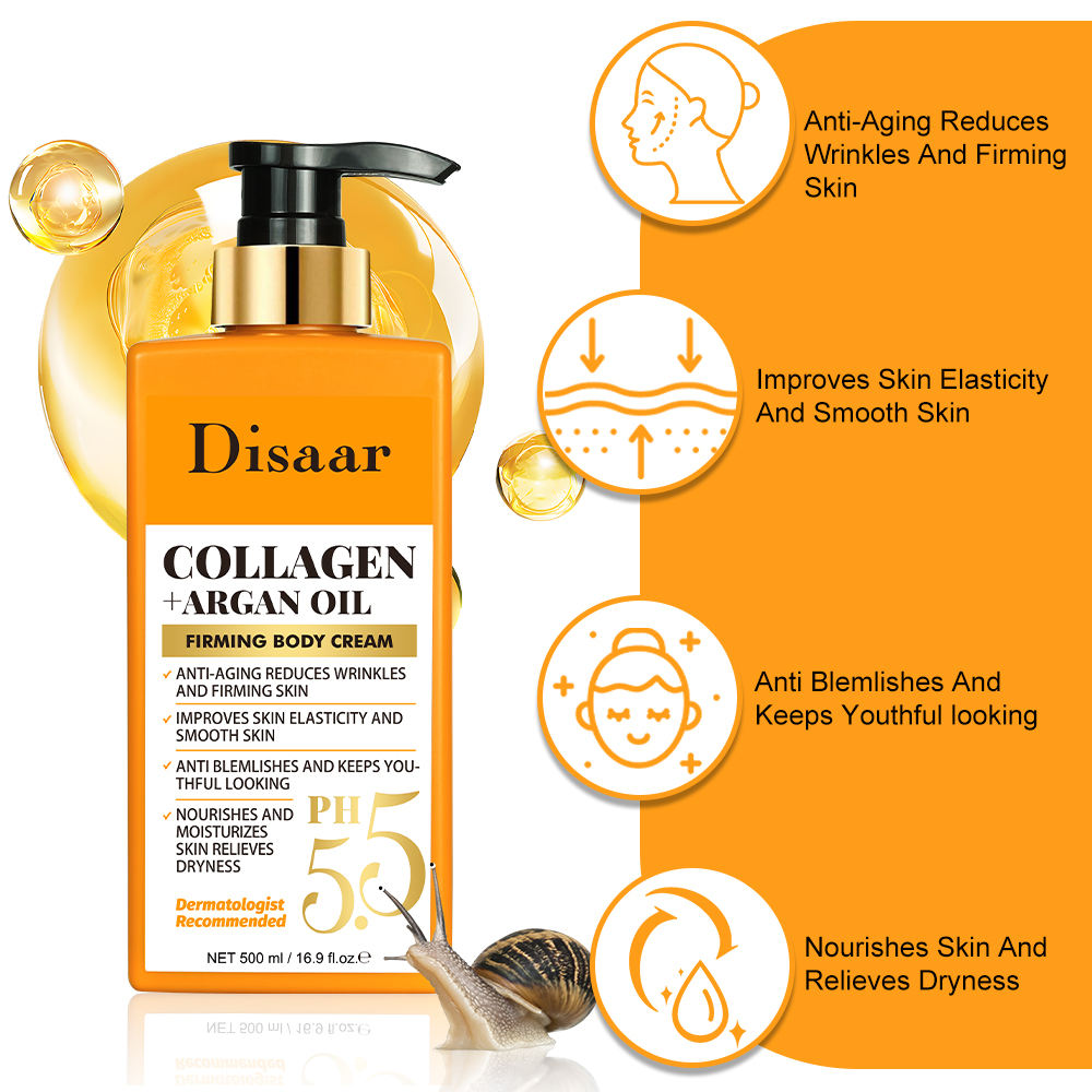 Disaar Collagen + Argan Oil Firming Body Cream. This cream is designed to intensely moisturize, firm, and rejuvenate the skin by combining collagen with antioxidant-rich argan oil.